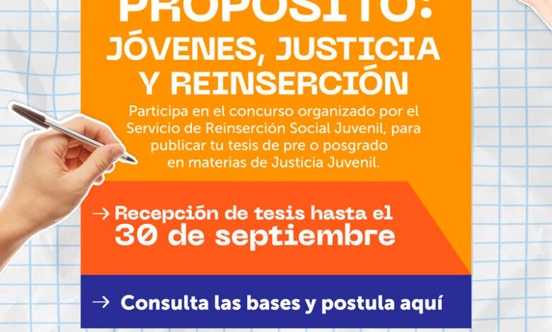 El Servicio Nacional de Reinserción Social Juvenil lanzó públicamente la convocatoria a participar del concurso “Tesis con Propósito: Jóvenes, Justicia y Reinserción”, una iniciativa que surge del compromiso del Servicio por fomentar la innovación, la investigación y el trabajo colaborativo con universidades, centros de estudio y profesionales del ámbito público y privado.